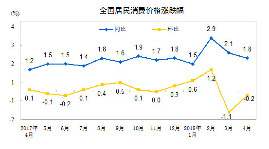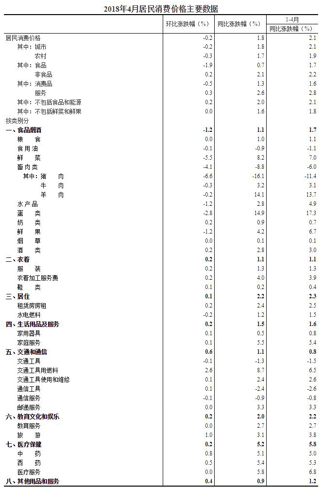 2018年4月份,全國居民消費價格同比上漲1.8%。其中,城市上漲1.8%,農(nóng)村上漲1.7%;食品價格上漲0.7%,非食品價格上漲2.1%;消費品價格上漲1.3%,服務價格上漲2.6%。1-4月平均,全國居民消費價格總水平比去年同期上漲2.1%。