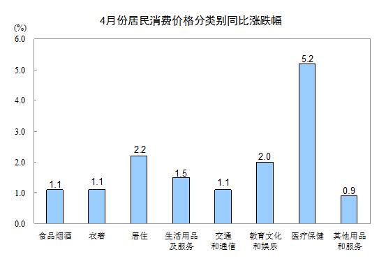 其他七大類價格同比均上漲。其中,醫(yī)療保健、居住、教育文化和娛樂價格分別上漲5.2%、2.2%和2.0%,生活用品及服務、衣著價格分別上漲1.5%和1.1%,交通和通信、其他用品和服務價格分別上漲1.1%和0.9%。