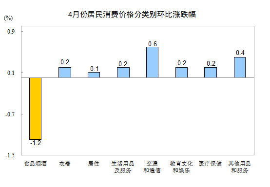 4月份,全國居民消費價格環(huán)比下降0.2%。其中,城市下降0.2%,農(nóng)村下降0.3%;食品價格下降1.9%,非食品價格上漲0.2%;消費品價格下降0.5%,服務價格上漲0.3%。