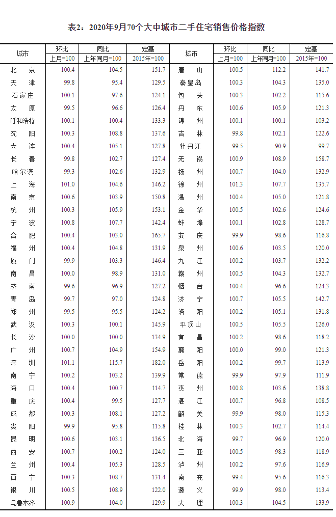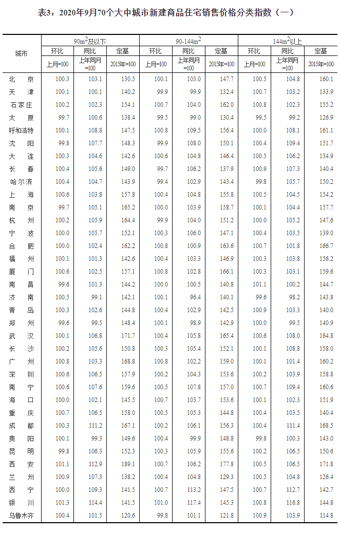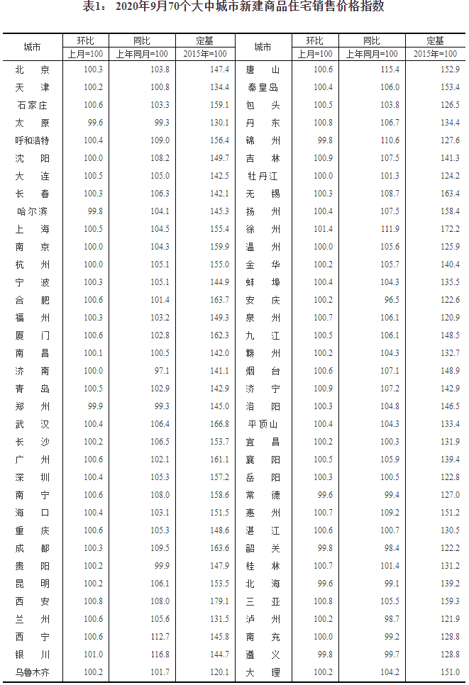 2020年9月份70個大中城市商品住宅銷售價格變動情況